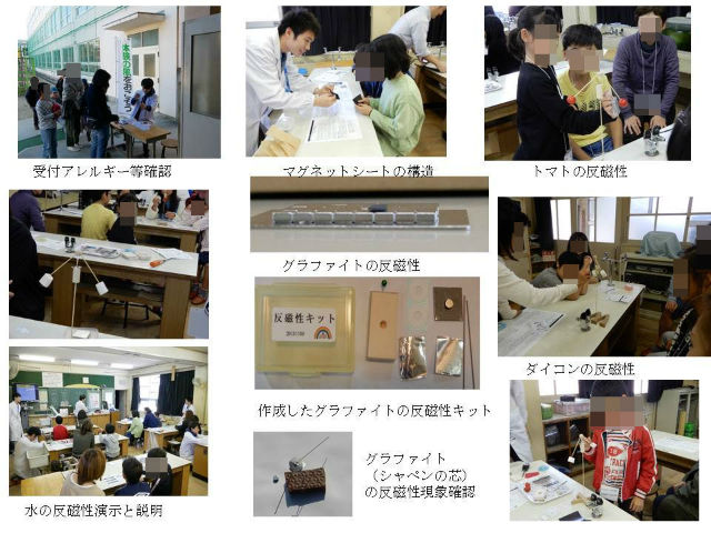 磁性は記憶素子や医療など色々のところで利用されている。物質はなんらかの磁性を持っている。 磁気ビュアーで磁力線を観察、温度を変えてキュリー点を観測した。磁区がわかる実験装置で強磁性物質の磁区について学習した。鉛筆の芯など色々なグラファイト製品をつかって反磁性の性質を確認した。またトマトやキュウリ、ダイコンなどは水の反磁性が現れることを確認した。電磁誘導の応用として、磁石に引き寄せられないアルミ缶では電磁誘導が起きて回転する。 アルミが水の上で電磁誘導により非接触で動く、1円玉と10円玉を分けるなど色々な応用について体験した。
